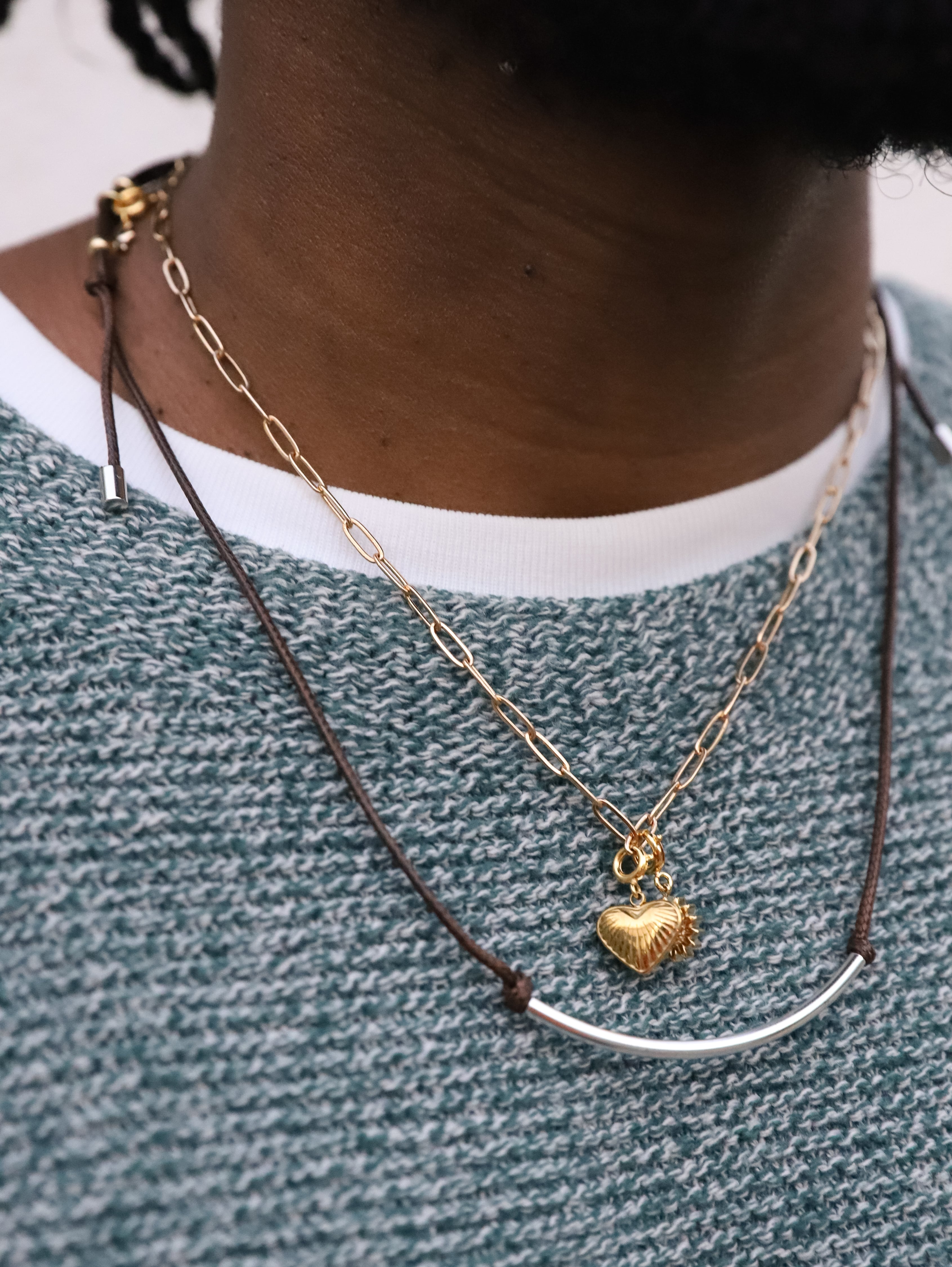 アイウェアを掛けないときはシンプルで合わせやすいネックレスに。
