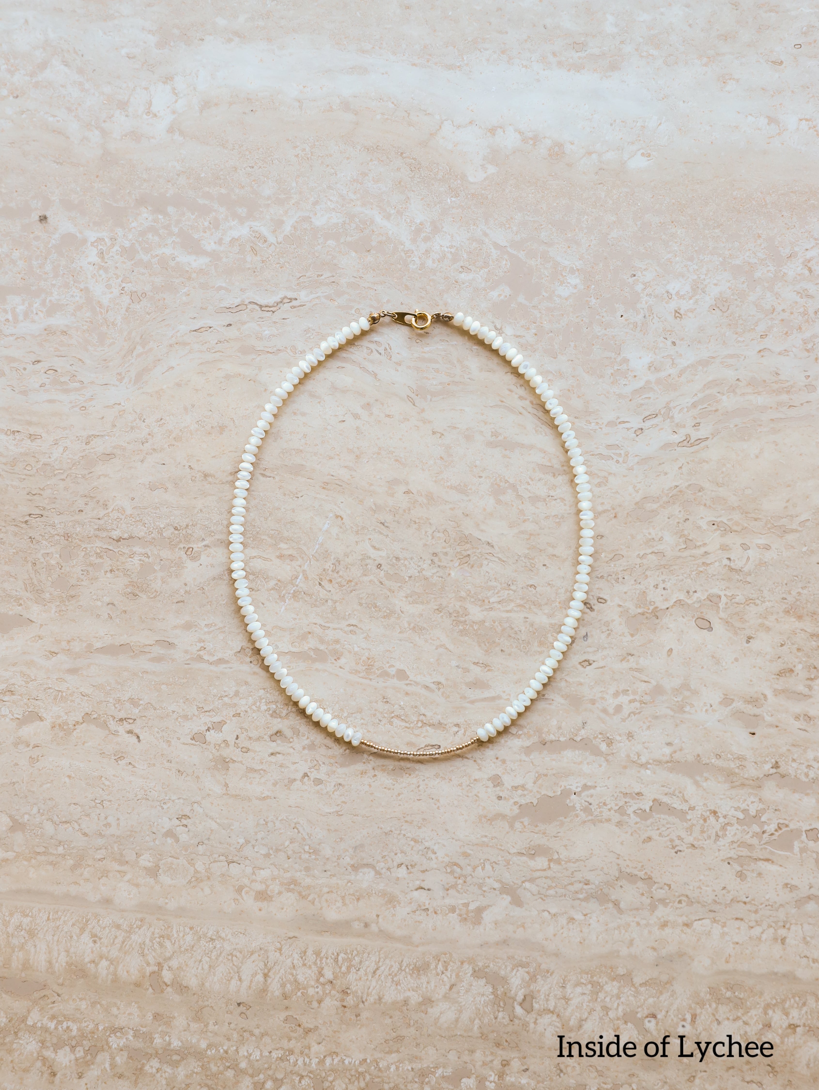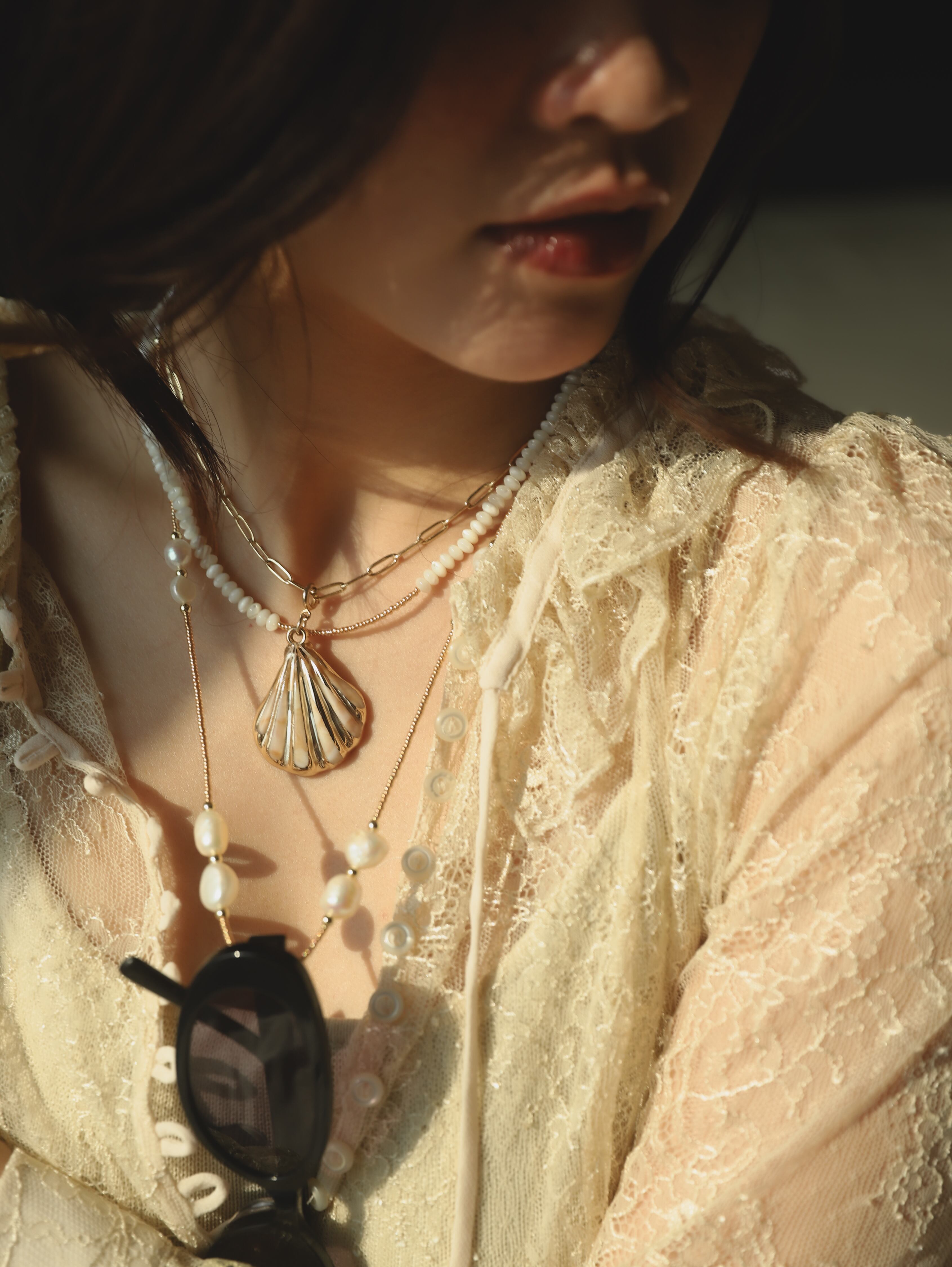 マザーオブパールを贅沢に使用したネックレス。真珠を生成している母貝を加工したもの