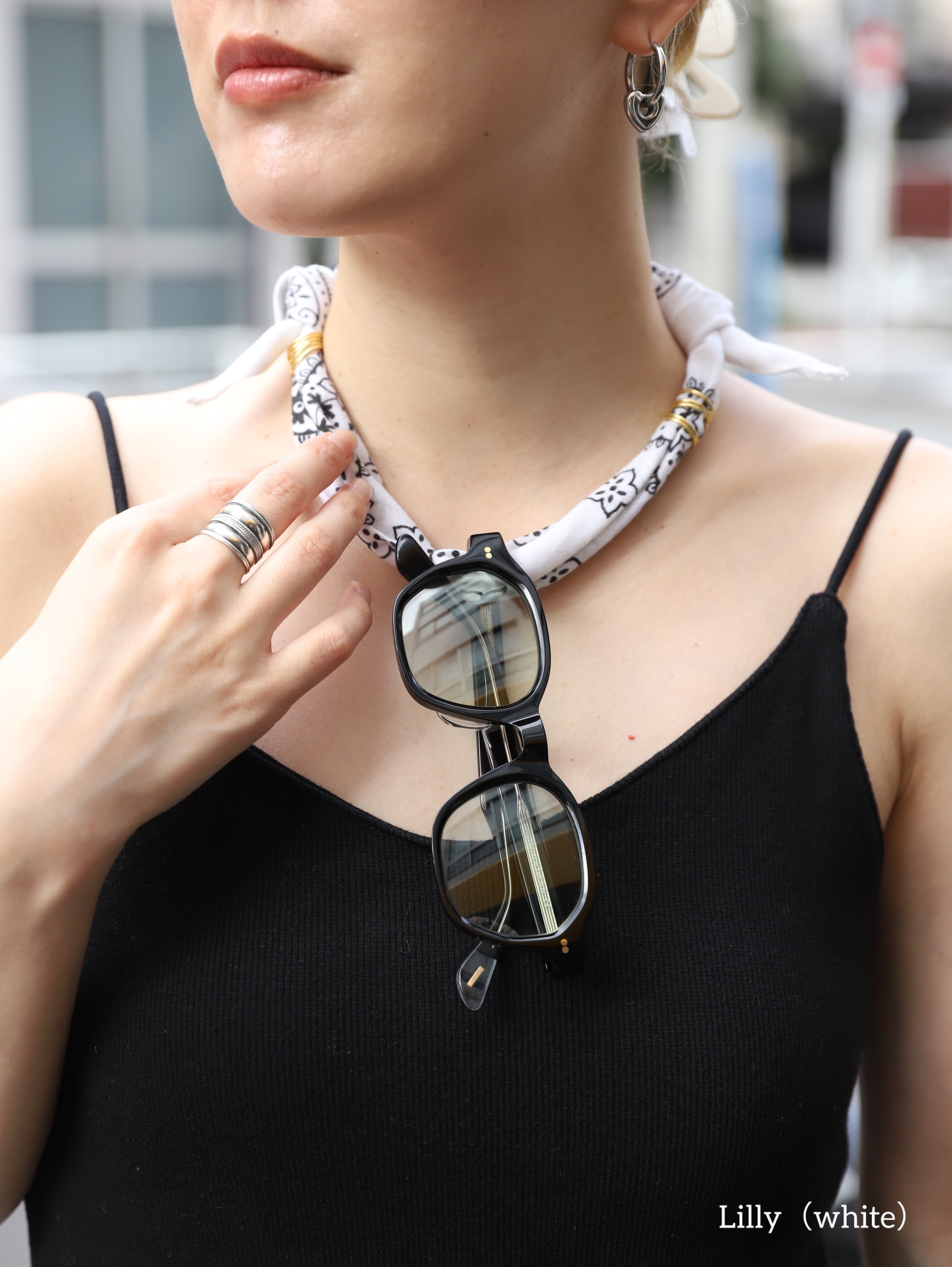 フロントにはアイウェアもかけて頂きやすいように厚みを調整。かつどんな装いにも合わせやすいボリューム感にしています。またご自身で長さを調整できます。