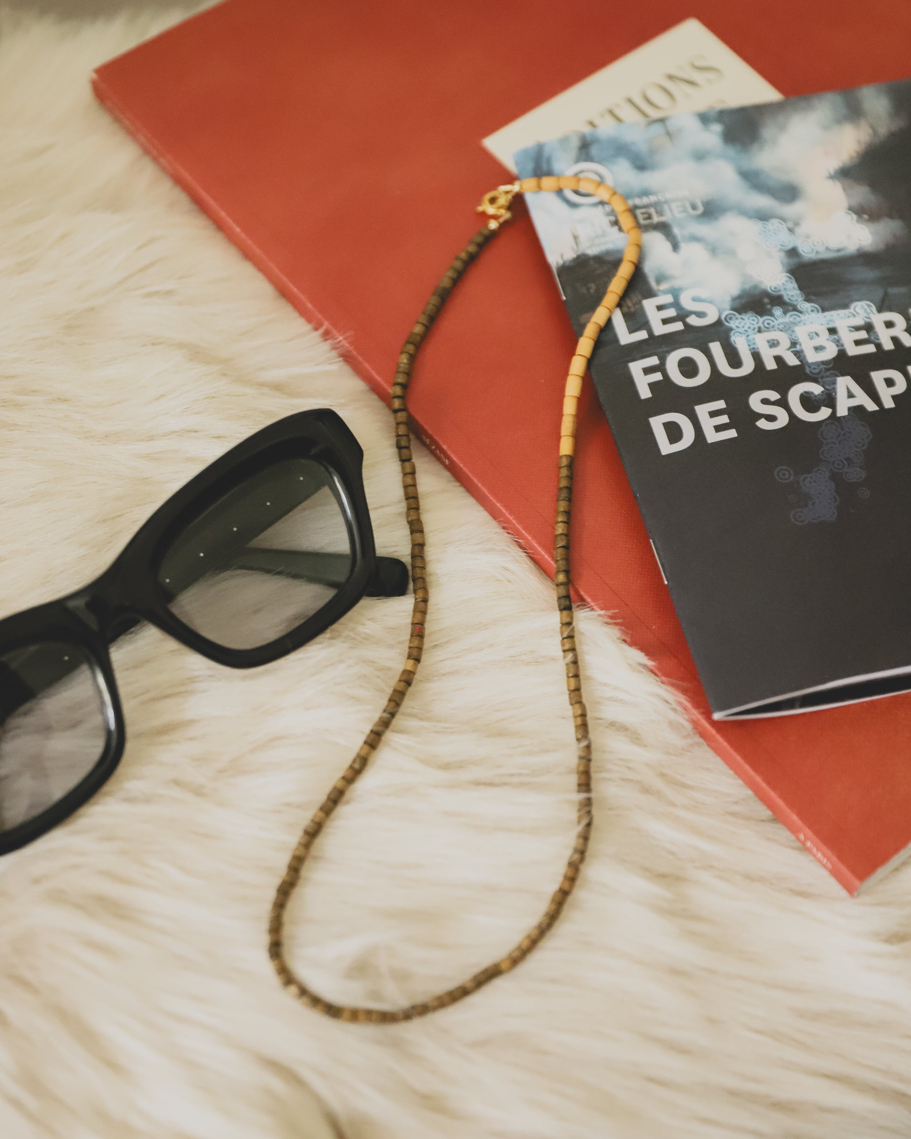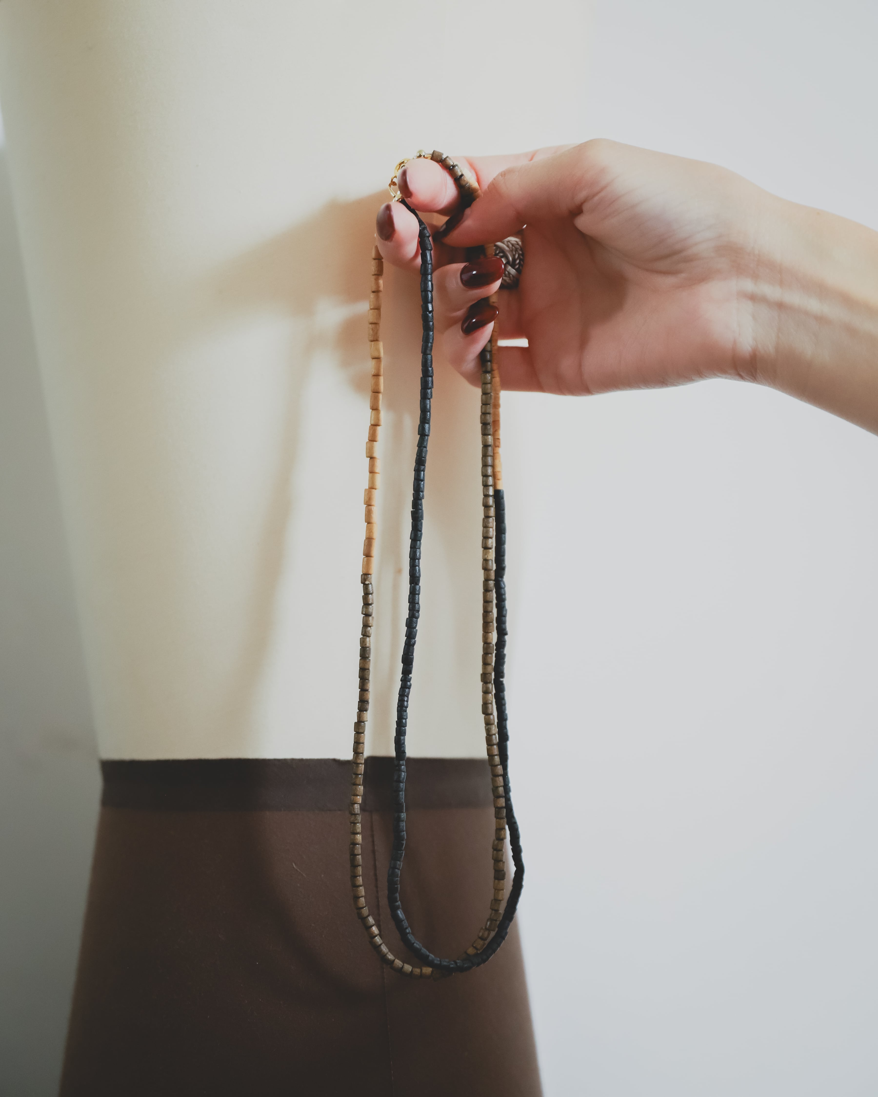 フック部分はワンストロークだけそのままのウッドのカラーのビーズを使い程よいアクセントに。スウェットやTシャツ、ニットなど選ばずに合わせやすく、Necklaceに初挑戦な方にもおすすめです。そして驚くほど軽くつけていることを忘れてしまうくらいです。